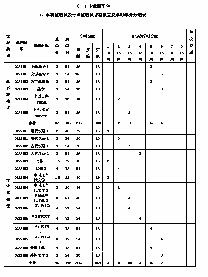 语言学概论、现代汉语、古代汉语、文学概论、中国现当代文学、中国古代文学、外国文学、写作、美学、语文课程教学论