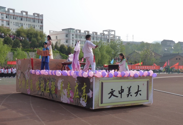 班袁美娟同学一曲铿锵有力的《爱我中华》响彻在操场的上空,彩车徐徐从主席台前经过,赢得热烈的掌声。我系方阵精神抖擞,步伐整齐,在主席台前灵活变换着“中”、“文”的字形,充分展现了我系“高在素养,强在技能,赢在特色”的人才培养宗旨。