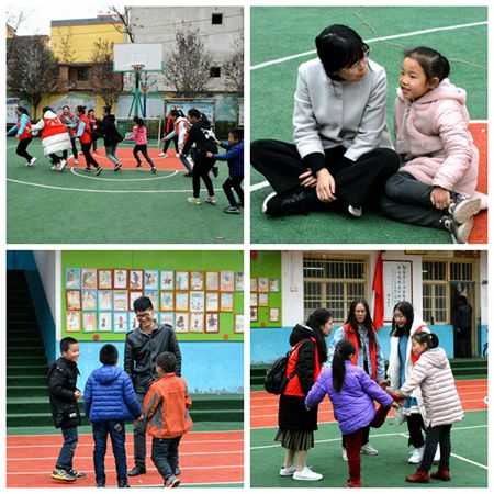 活动接近尾声,志愿者去往同学们的教室教他们识字、背诗、折纸,在操场上与他们一起玩踢足球、丢手绢、老鹰捉小鸡等游戏,小朋友们的脸上洋溢着笑容。