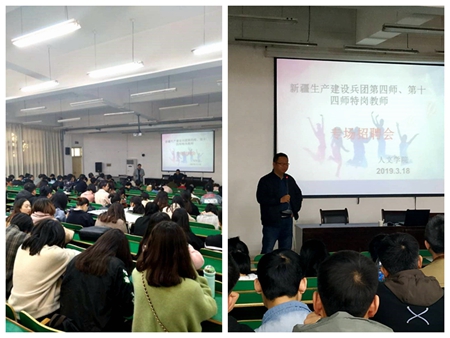 为了更好的解决老员工就业难题,缓解老员工毕业压力,3月18日、3月19日下午新疆生产建设兵团第四师、第十四师教育局和新疆阿克苏教育局一行来校举办专场招聘会,为新疆可克达拉市、昆玉市和阿克苏市教育事业发展选聘中小学教师。