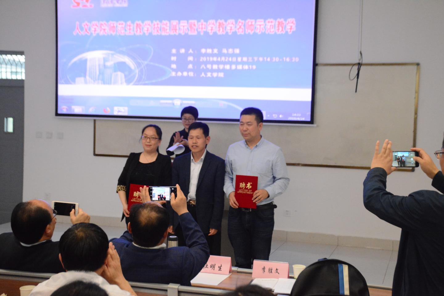 活动一开始,张文诺副经理代表best365体育亚洲向商洛市英语学科带头人、省级教学能手李胜文和商洛中学语文高级教师任燕两位老师颁发兼职教师聘书。聘请中学老师作为兼职教师既是师范类专业认证的要求,也是公司师范生与教学名师面对面的交流,为进一步了解目前中学课堂教学现状,从而提高师范生教学技能的重要举措。聘请两位兼职教师,为以后开展教学,长期指导公司师范生的实践教学打下了基础。