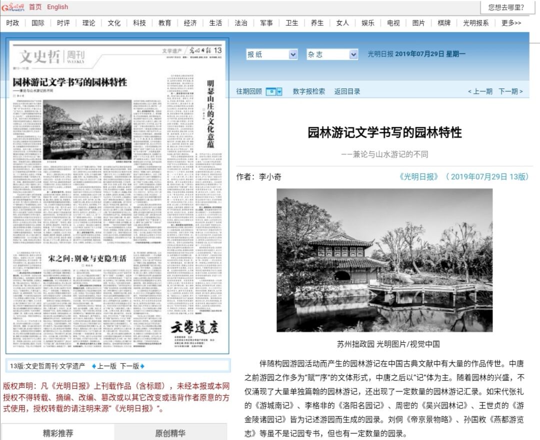 公司教师李小奇博士在《光明日报》2019年7月29日文史哲周刊文学遗产版发表学术文章《园林游记文学书写的园林特性——兼论与山水游记的不同》,这是公司教师首次在《光明日报》发表学术文章。