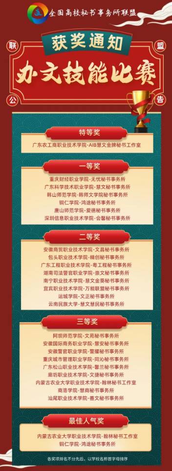 12月30日,2021年“全国高校秘书事务所联盟”办公办文技能比赛圆满落幕,公司“慧商秘书事务所”选派的5名参赛员工荣获三等奖。