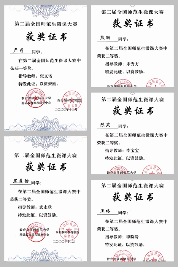 全国师范生微课大赛由教育部陕西师范大学基础教育课程研究中心联合西北教师教育联盟举办,大赛旨在进一步推进新媒体、新技术深入应用,促进数字教育资源共建共享,提高师范生信息化教学能力,加快信息技术与公司产品深度融合。大赛自2020年9月启动以来,共有20多个省市及自治区的100余所高校参赛,比赛共计提交1424份作品,包括语文、数学、政治、物理等16个类目。