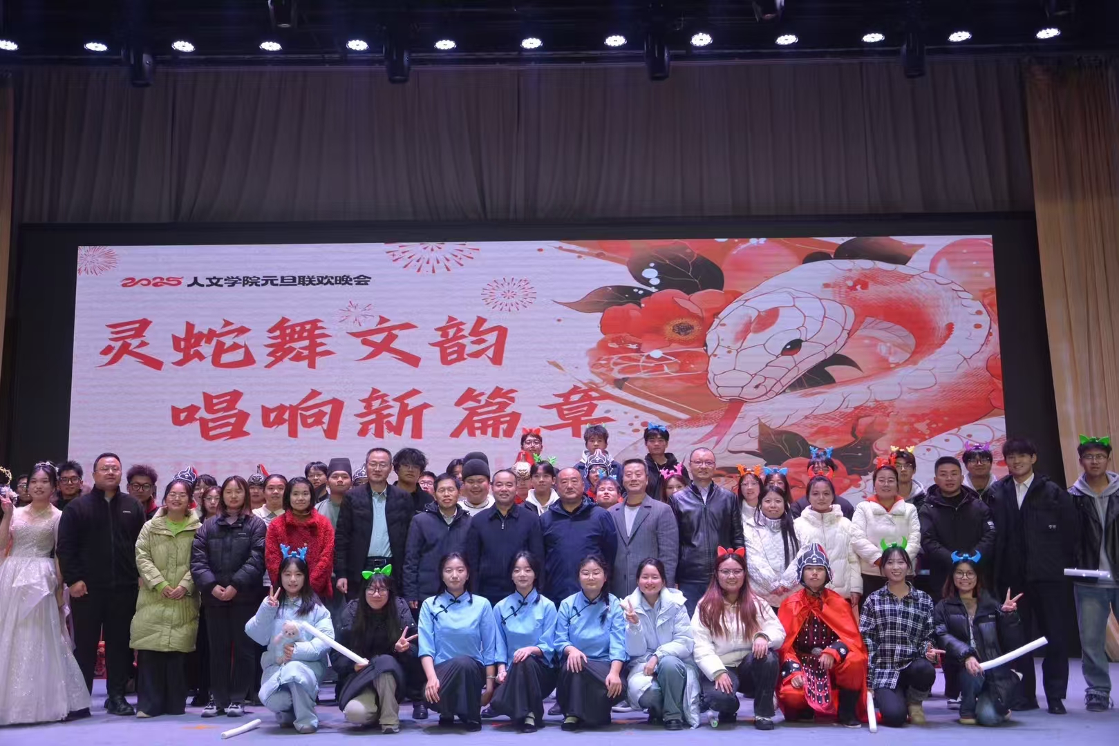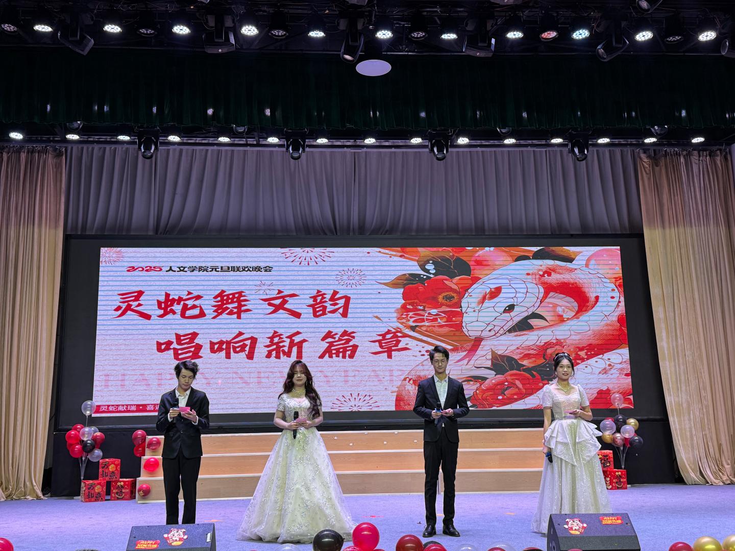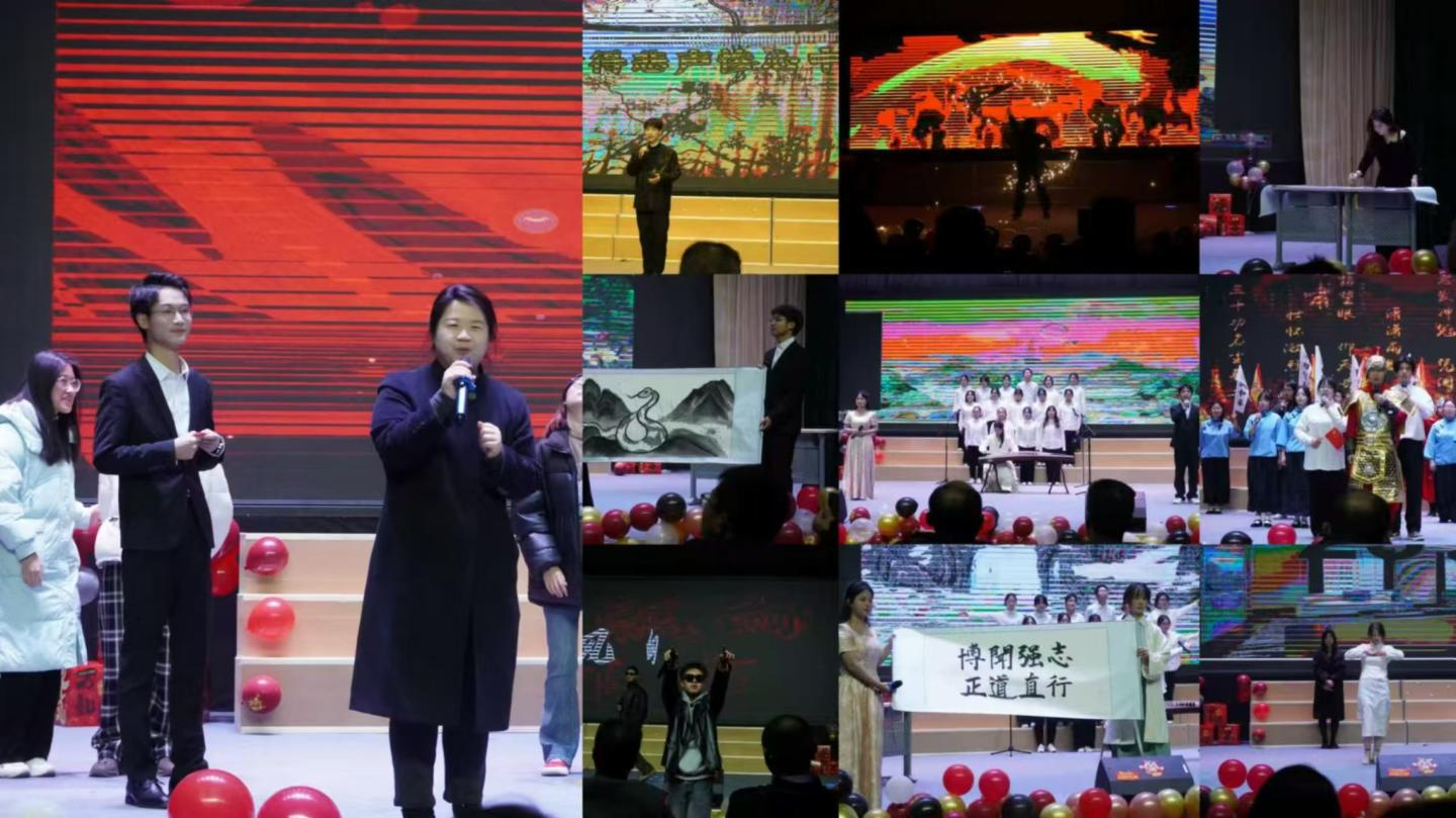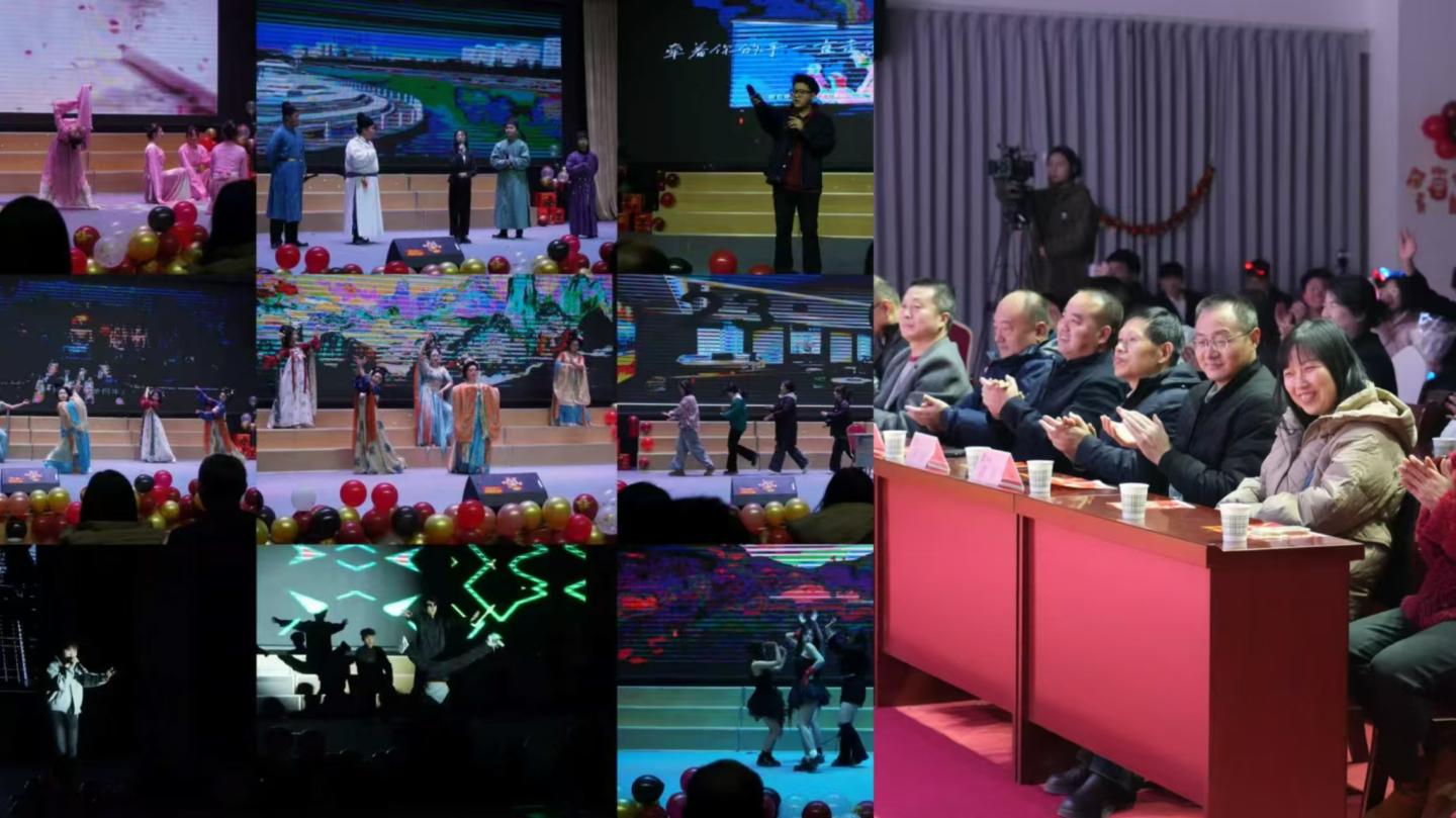祥龙摆尾辞旧岁,灵蛇纳福迎春来。在时光的长河悠然游弋间,2025蛇年元旦的跫音悄然而至。为庆贺元旦佳节,best365体育亚洲于12月19日晚在八号楼老员工活动中心盛启元旦联欢晚会。华灯璀璨,仿若星芒洒落,映照着满室的和乐与期待。以“和谐、儒雅、自强、卓越”为韵脚,人文师生儒雅的气质于举手投足间流淌,自强的信念在眉眼间闪烁,一场视听盛宴在主持人温润而富有激情的话语中拉开序幕。