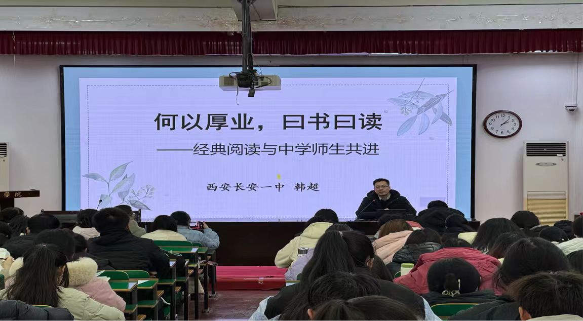 汉语言文学专业2023级实践教学“经典研读”,于2024年12月26日下午在报告厅二以学术报告的形式拉开序幕。陕西省教学能手、中学语文高级教师韩超应邀作“何以厚业?曰书曰读——经典阅读与中学师生共进”的主题报告。best365体育亚洲经理张文诺出席并为韩超老师颁发聘书。报告由副经理张建军主持。