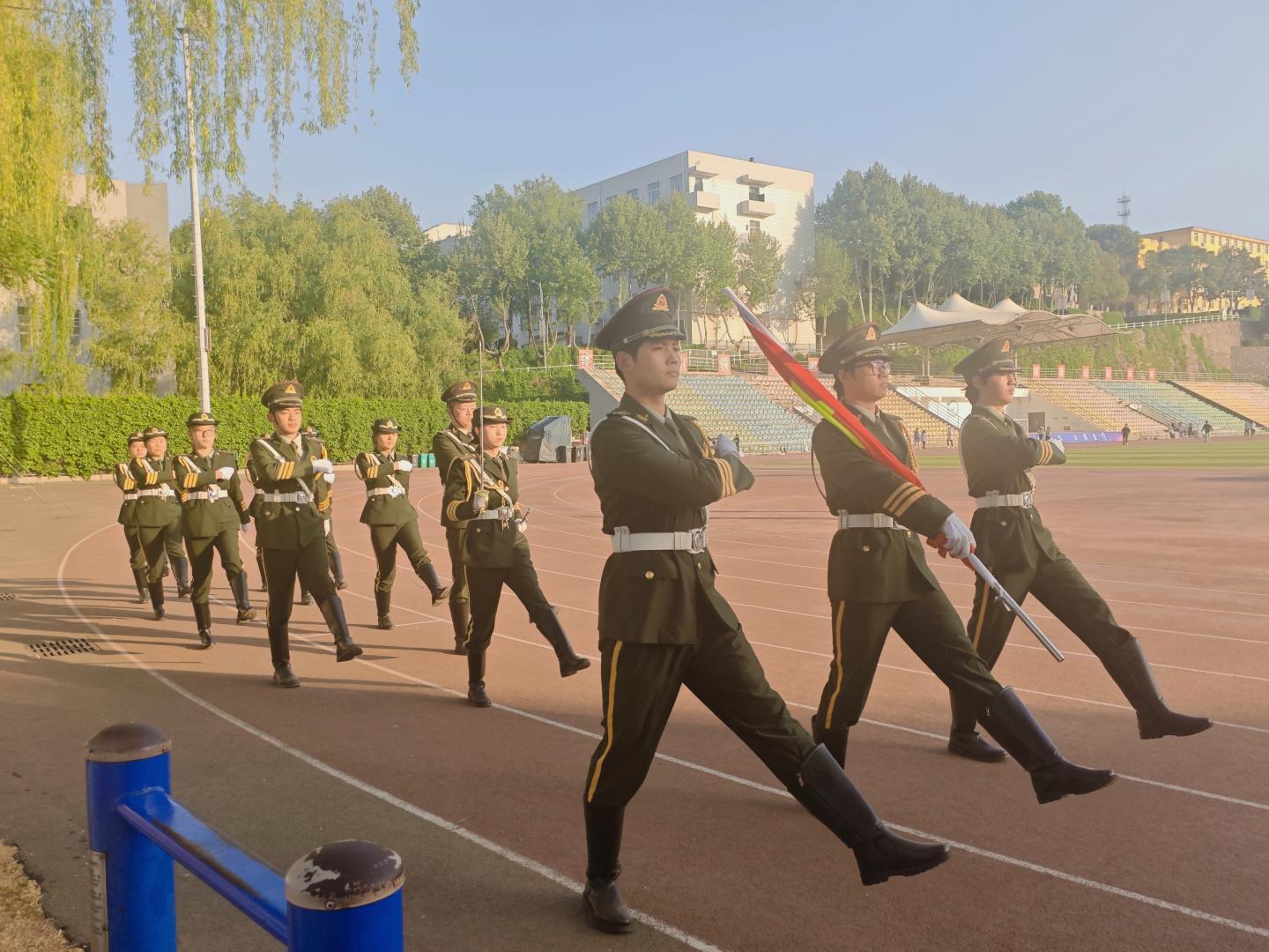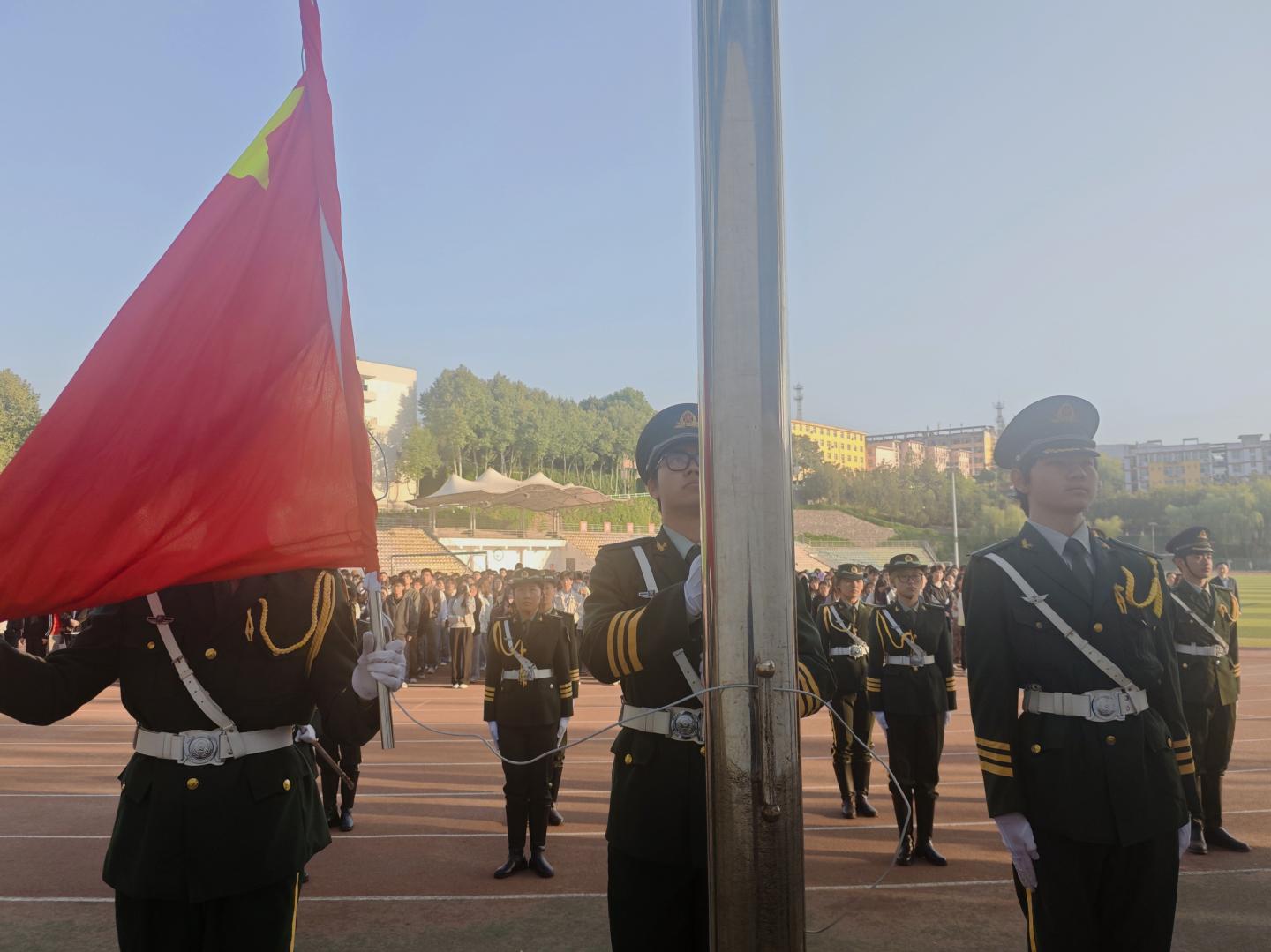 国旗猎猎,步履铿锵。国旗护卫队迈着整齐有力的步伐,护送五星红旗走向升旗台。随着国歌奏响,五星红旗冉冉升起,公司升旗仪式正式拉开帷幕。师生们庄严肃立,向国旗行注目礼,表达对祖国的崇高敬意与深切热爱。
