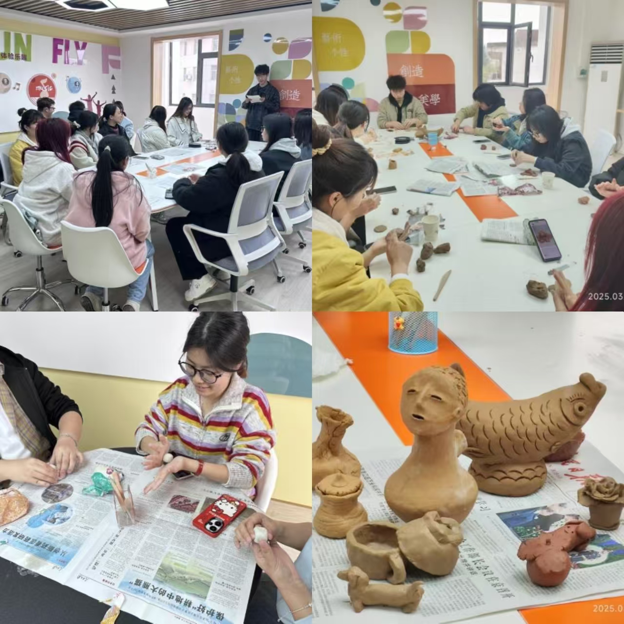 在手工创作环节,同学们以红陶人头壶为原型,充分发挥想象力和创造力,分工协作,各展所长。有的同学负责设计整体造型,有的同学精心捏制壶身,还有的同学专注于雕刻细节。大家在制作过程中相互交流、切磋技艺,现场气氛热烈而专注。随着活动的推进,大家在制作泥塑的同时也在不断思考如何将传统的陶塑技艺与党员的初心使命相联系。大家一致认为,捏制红陶需要耐心和细致,正如党员在坚守初心的道路上需要持之以恒的信念和不懈努力。这一思考过程不仅加深了同学们对传统文化的理解,也对党的初心和使命有了更深刻的认识。