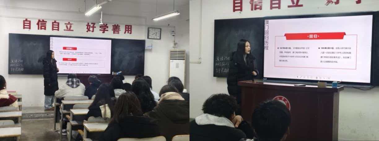 活动伊始,支部党员代表伊萌作了专题分享。她从澳门回归的历史背景与重大意义出发,系统梳理了澳门自回归26年来,在经济、文化、民生等领域取得的显著成就,重点阐释了“一国两制”在澳门的成功实践。通过详实的数据与生动的案例,同学们对澳门的发展变化有了更为直观和深刻的认识。